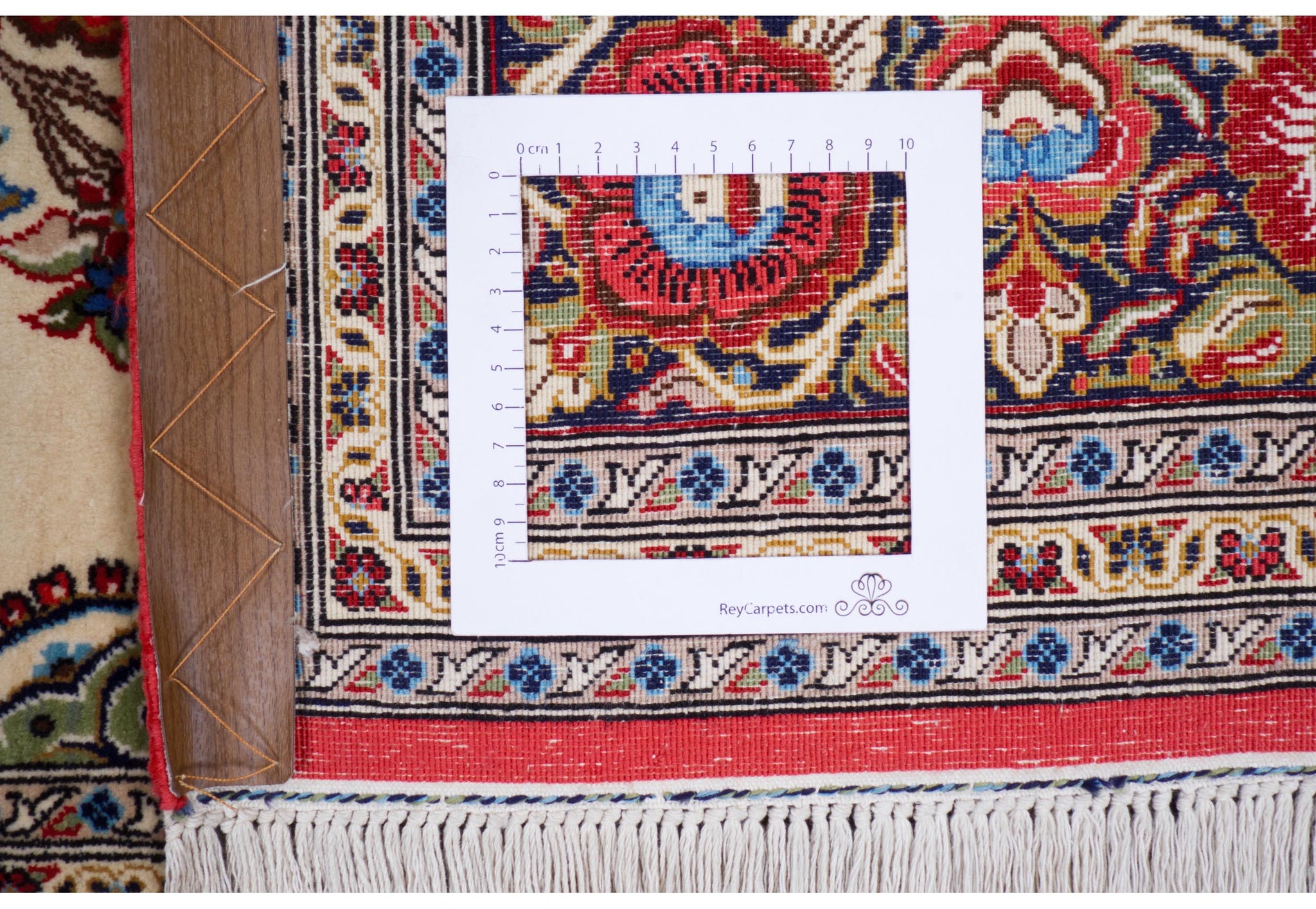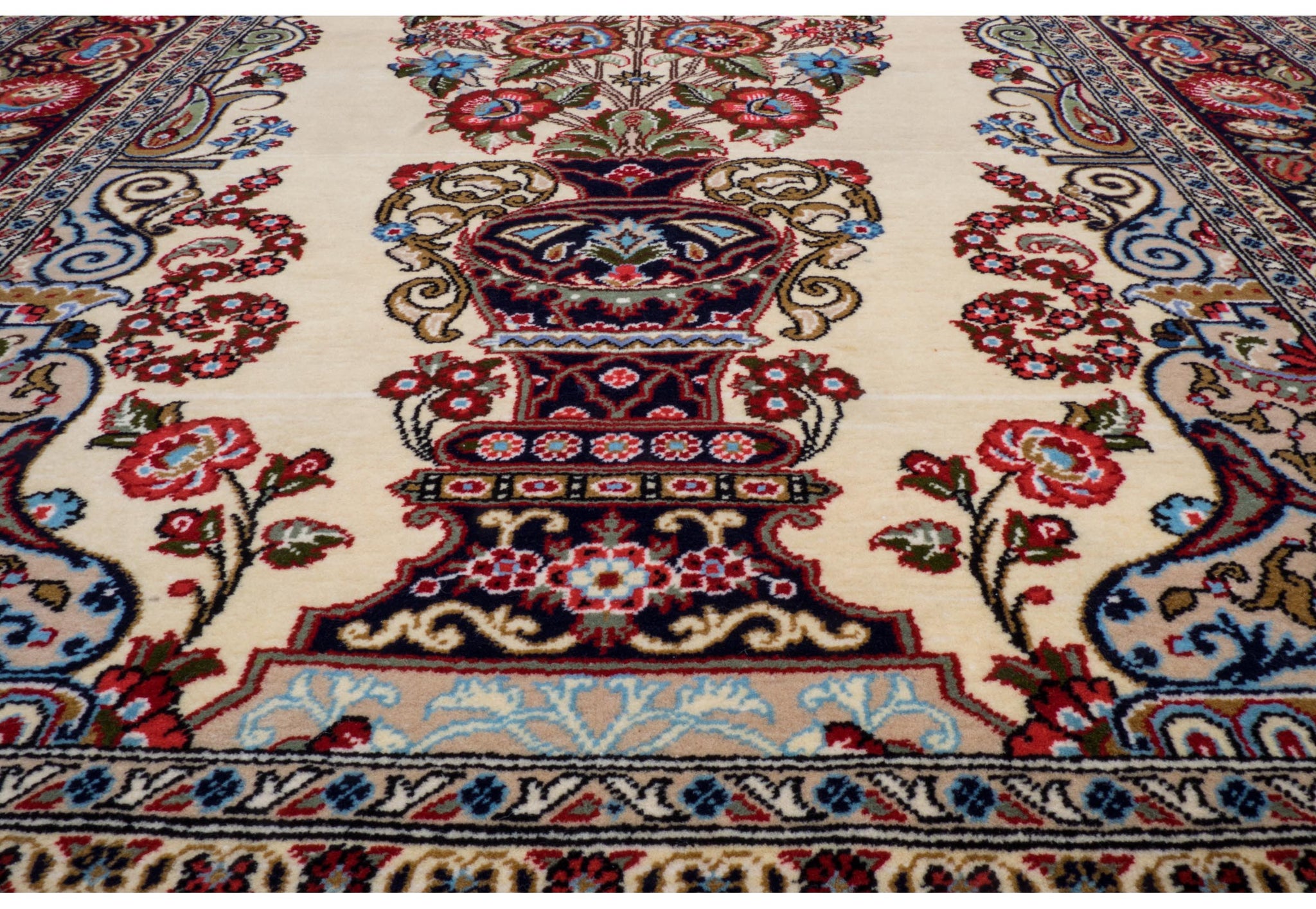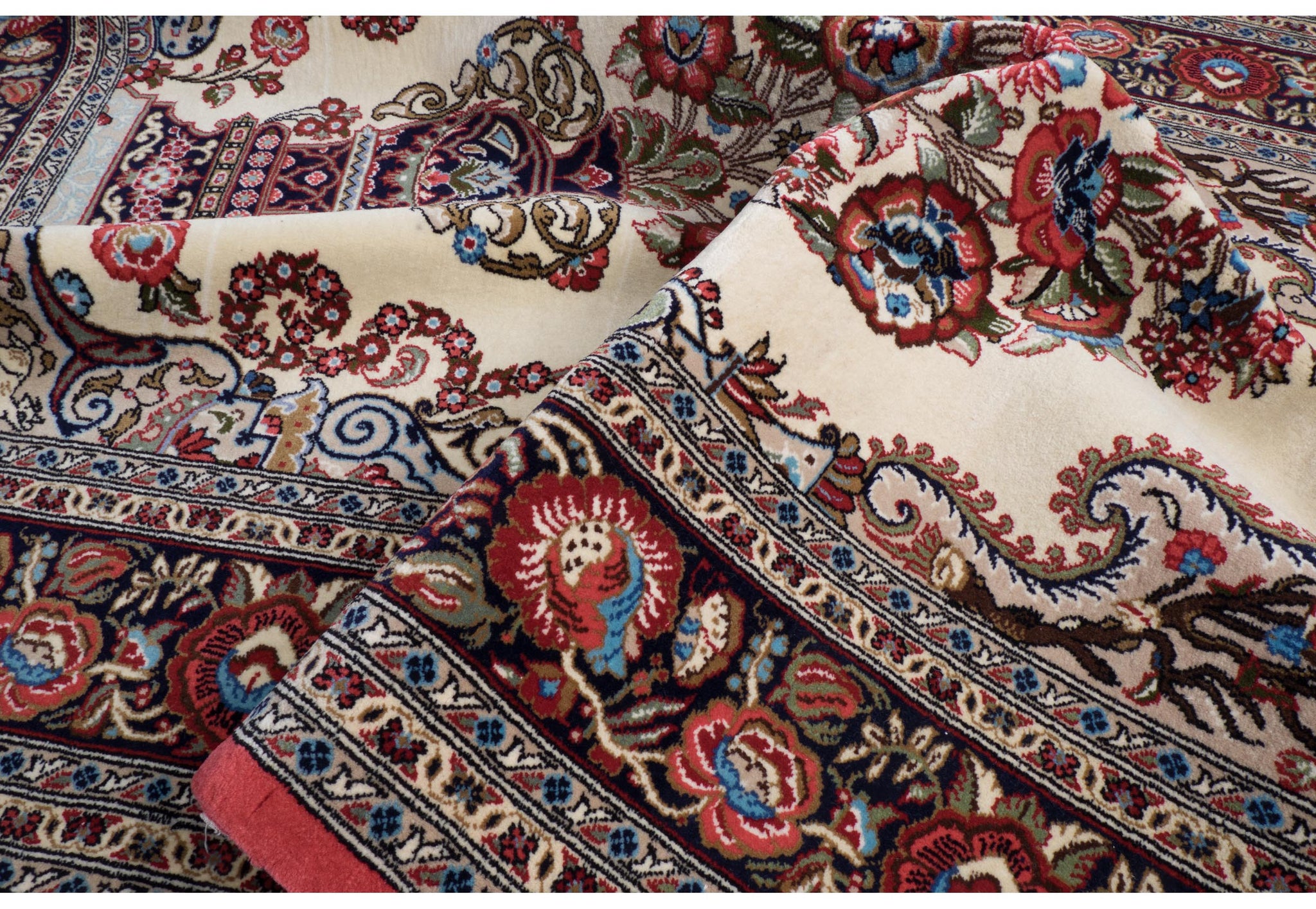 La produzione di tappeti a Qom è cominciato 100 anni fa. I fondatore delle filiera erano i commercianti di Kashan e i primi disegni erano basati su quelli di Isfahan e Kashan ma gli artigiani di Qom hanno rapidamente sviluppato uno stile autonomo e hanno portato i loro prodotti a livello di vere e proprie opere d’arte.\nCaratteristiche tecniche: Nodo asimmetrico in lana, lana kurk e seta o seta, trama doppia in cotone e ordito in cotone per tappeti di lana e in seta per tappeti di seta