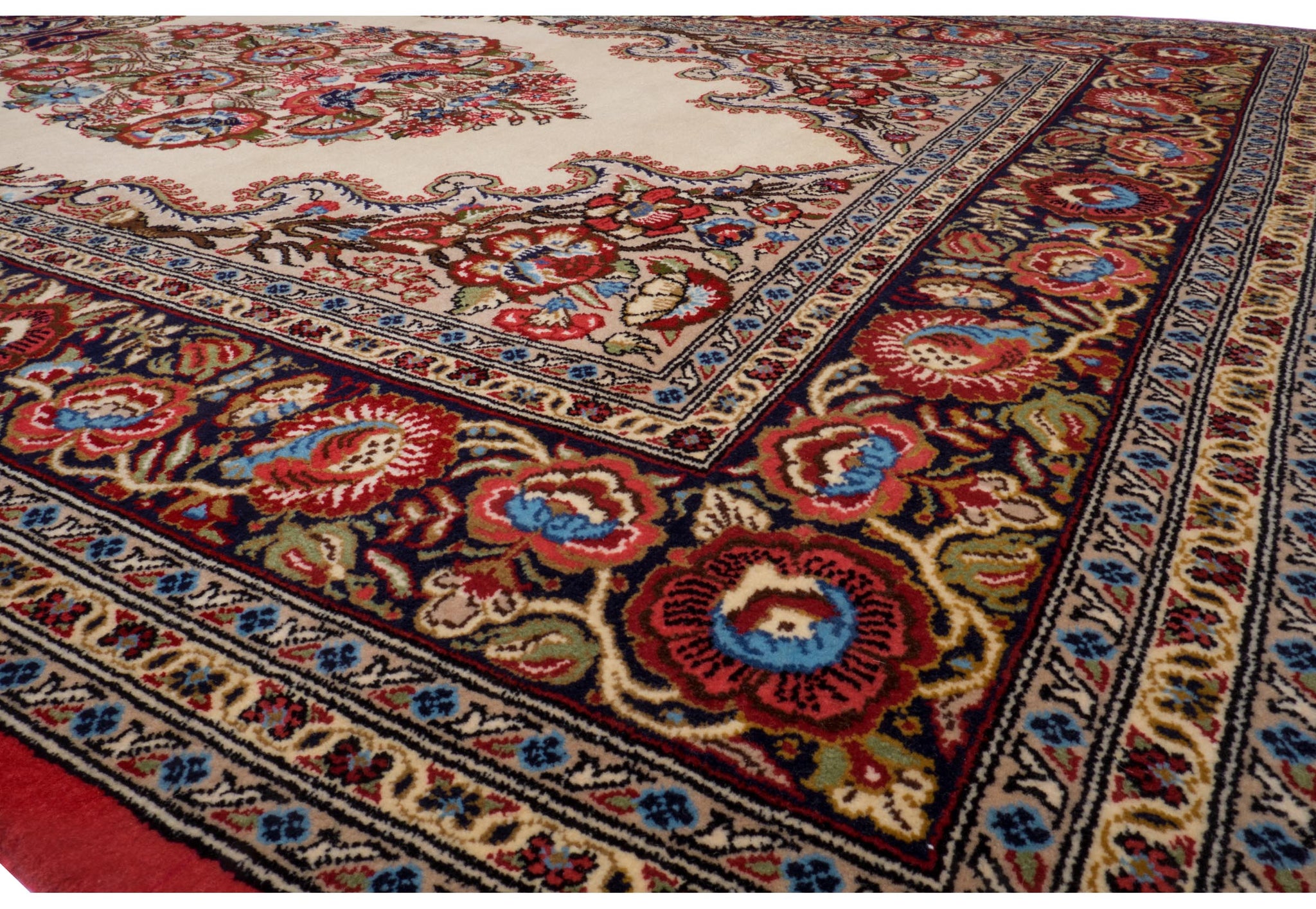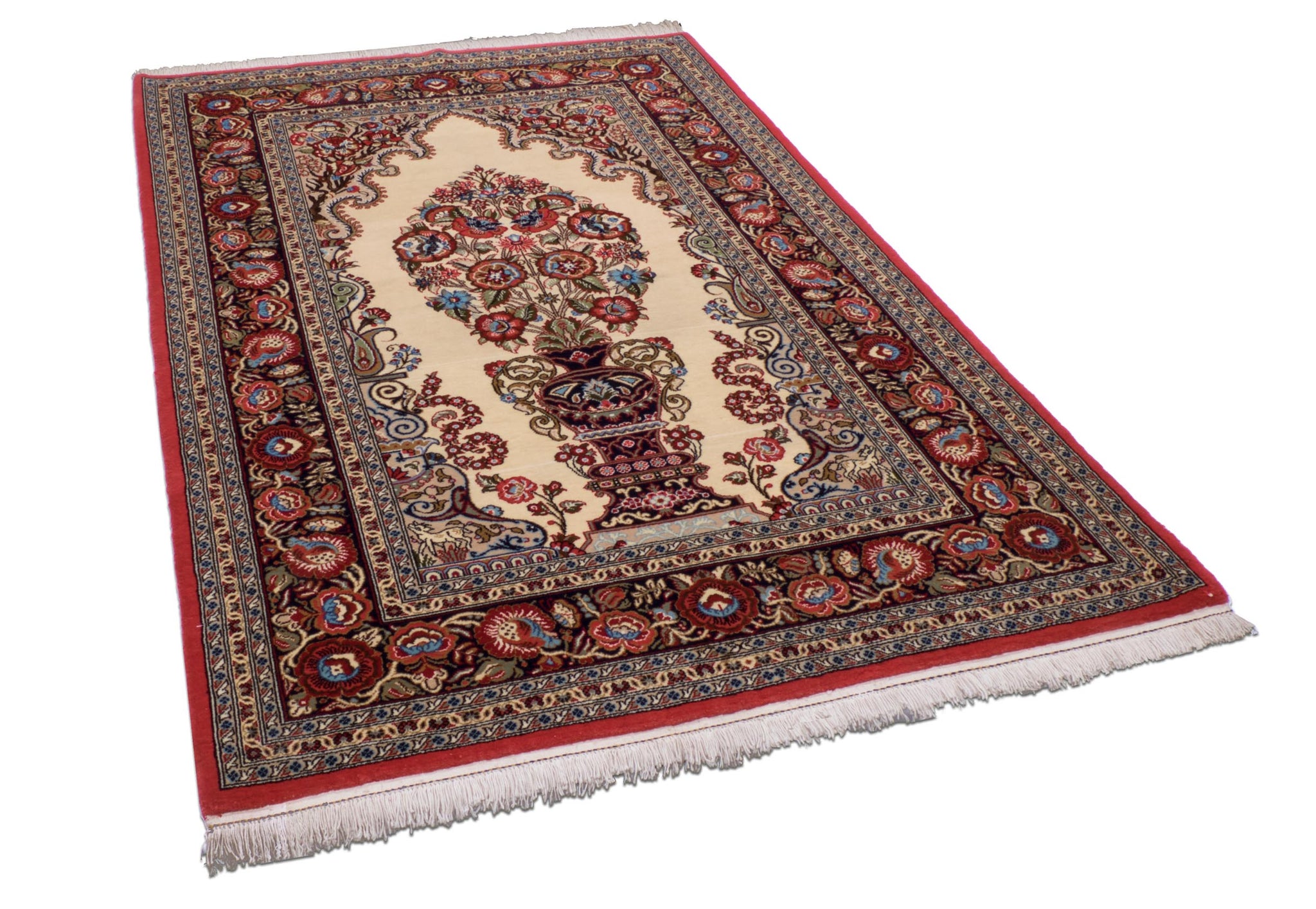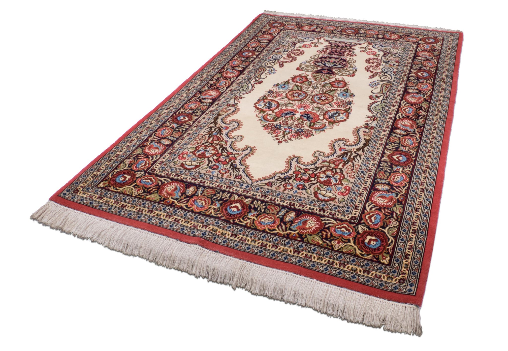 La produzione di tappeti a Qom è cominciato 100 anni fa. I fondatore delle filiera erano i commercianti di Kashan e i primi disegni erano basati su quelli di Isfahan e Kashan ma gli artigiani di Qom hanno rapidamente sviluppato uno stile autonomo e hanno portato i loro prodotti a livello di vere e proprie opere d’arte.\nCaratteristiche tecniche: Nodo asimmetrico in lana, lana kurk e seta o seta, trama doppia in cotone e ordito in cotone per tappeti di lana e in seta per tappeti di seta