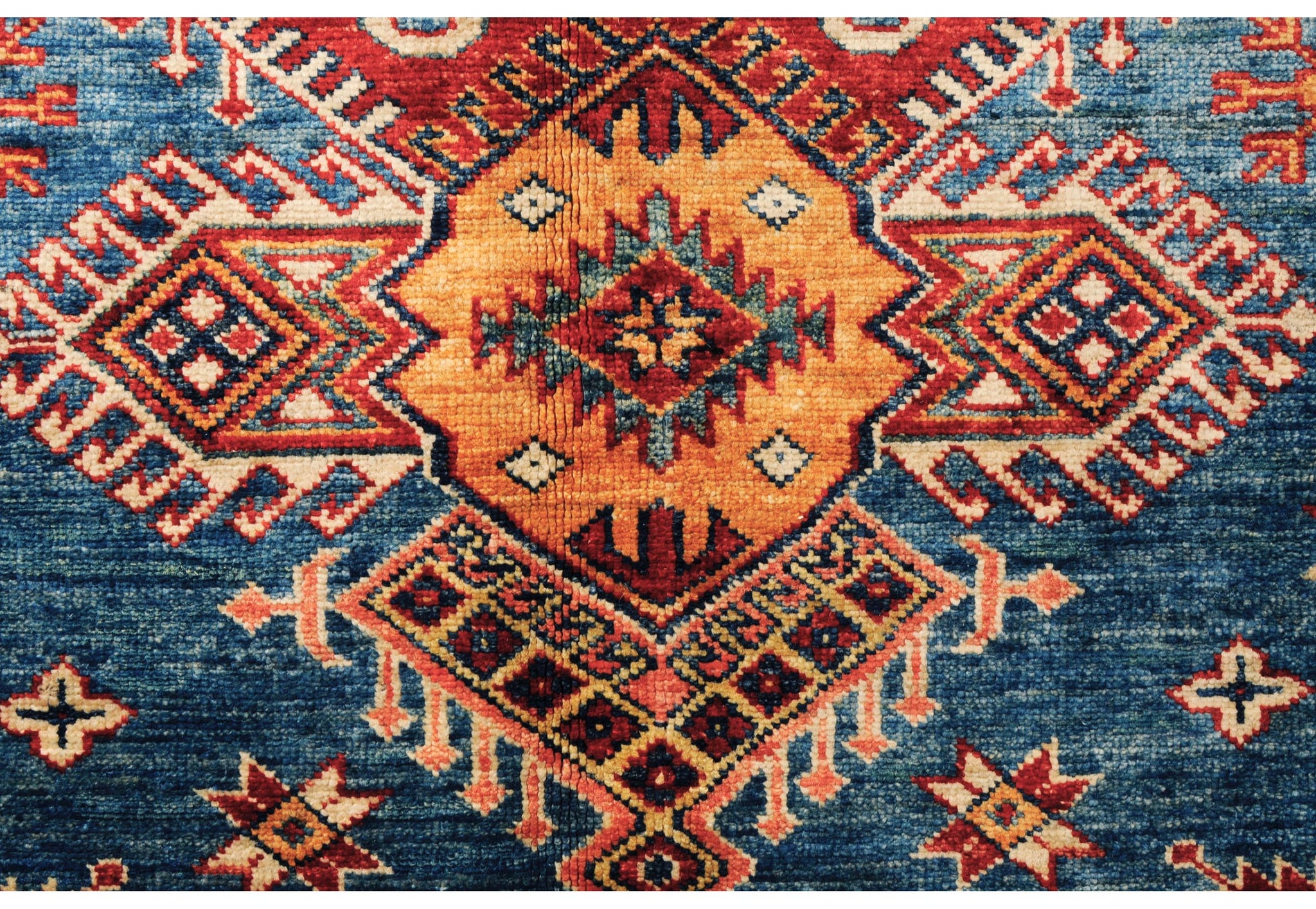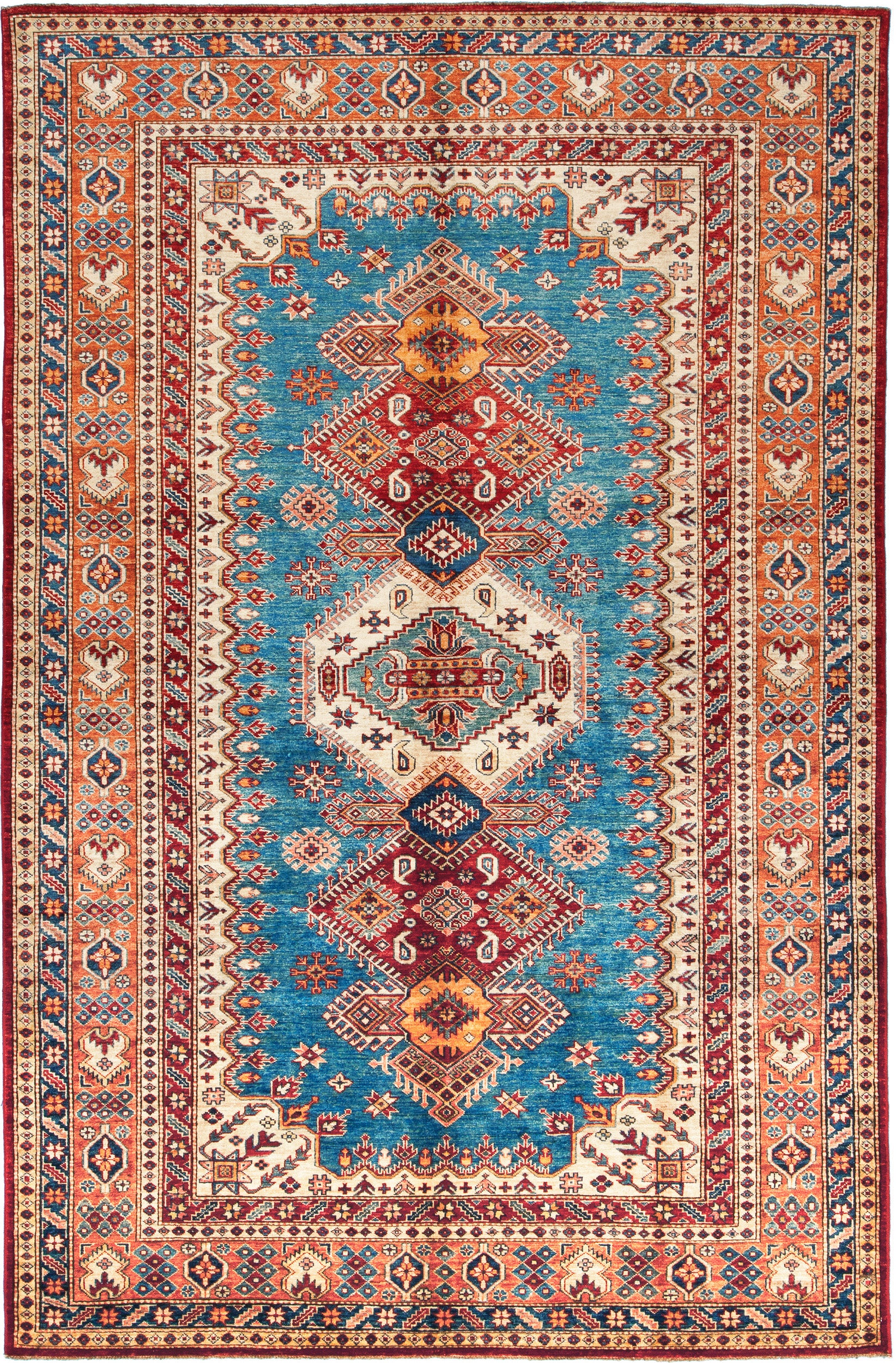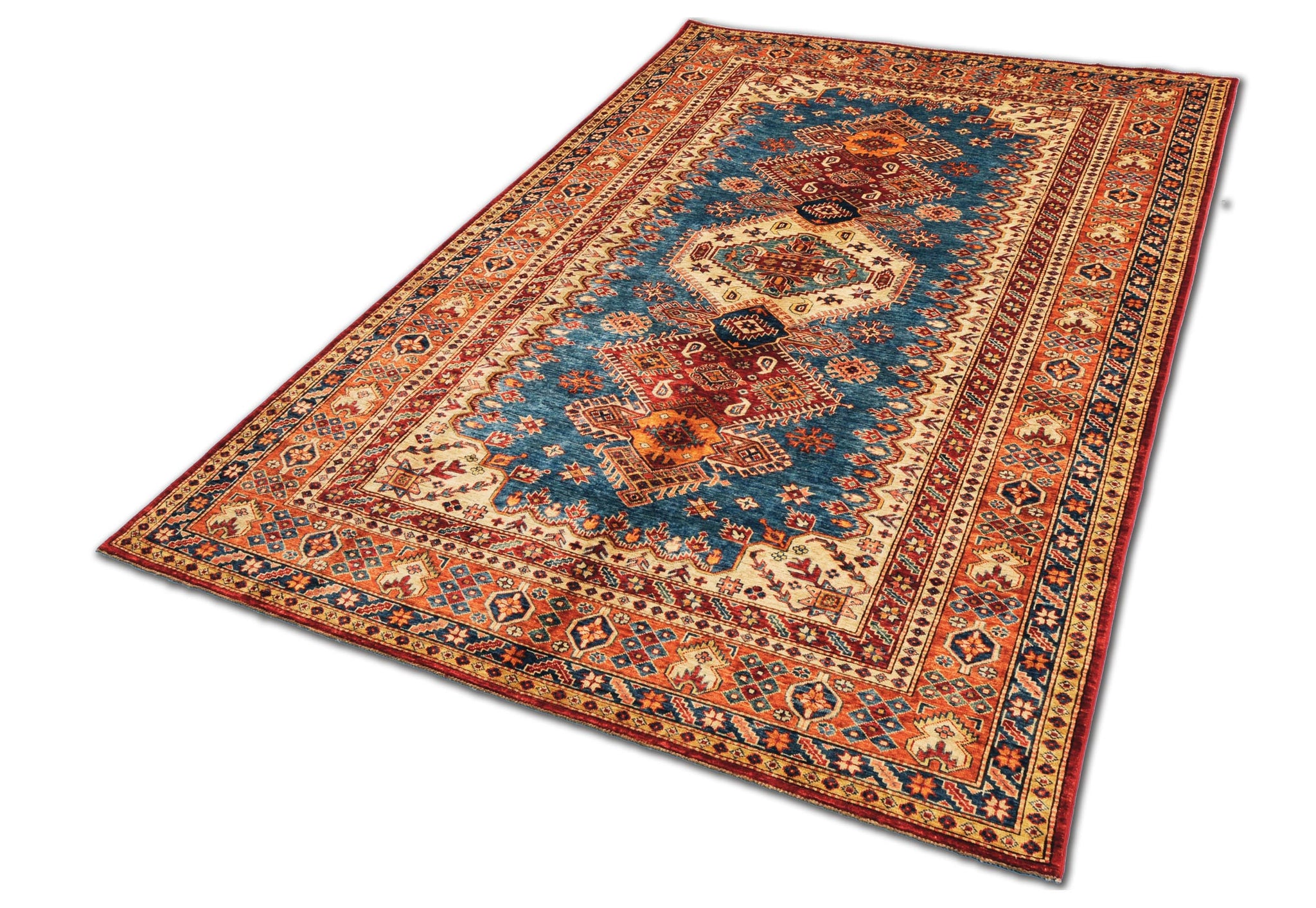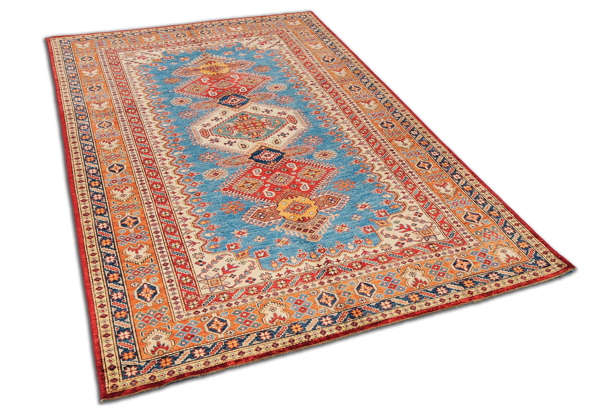 IL nome Kazak (Caucasico) indica tappeti con disegni concepiti interpretando in chiave moderna i disegni caucasici. E' prodotto in diverse categorie totalmente in lana con colori vegetali. \nE' un prodotto Afghano-Pakistano